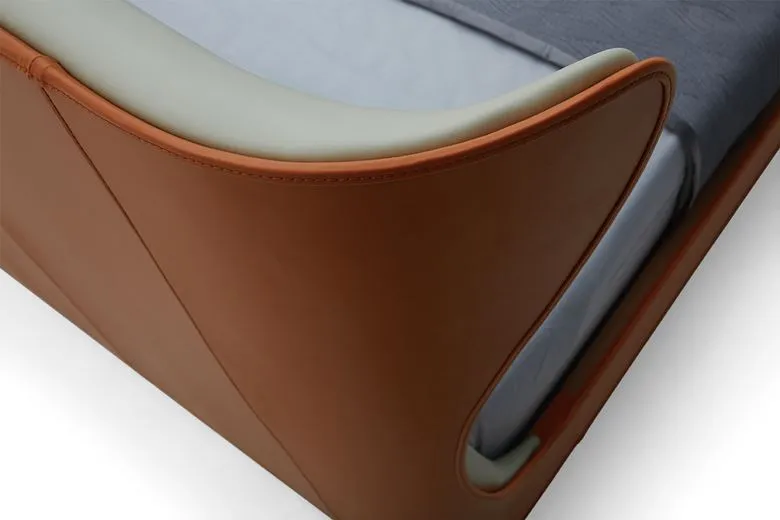 কিং বেড বেসে চারটি শক্ত ছাই কাঠের পা এবং ছদ্মবেশী চামড়ার তিনটি দিকের সমাপ্তি রয়েছে